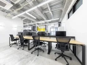 通常、コワーキングスペースはオープンなレイアウトで、個別のデスクやオフィス、会議室などの設備を共有して利用できます。