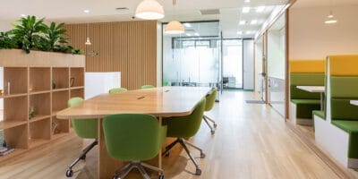 通常、コワーキングスペースはオープンなレイアウトで、個別のデスクやオフィス、会議室などの設備を共有して利用できます。