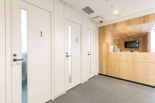 予約した拠点に到着したら、まずは受付へお越しください。予約確認後に、個室へのご案内を行います。