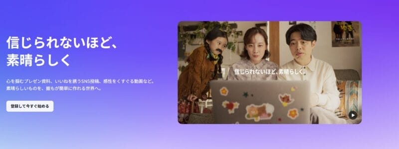 豊富なテンプレートと100万点以上の素材に加え、AI画像生成や動画編集機能も備えています。